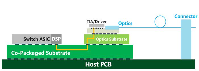 传统可插拔光模块到交换机 ASIC 芯片电信号连接距离较长,途经点较多,累积损耗大。通过 CPO/NPO 等封装技术的引入,显著缩短了交换芯片和光引擎间的距离,同时能够提供更高密度的高速端口,更适合在 1.6T 速率后实现高算力场景下的低能耗、高能效。