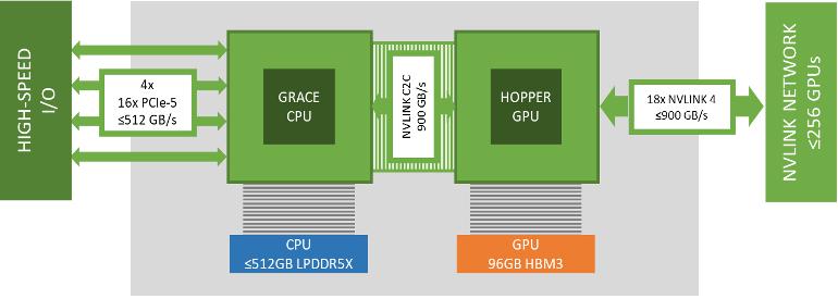NVIDIA Grace Hopper 架构中,完美的解决了大模型训练的内存墙问题。在该架构中,Grace CPU 和 Hopper GPU 使用带宽高达 900 GB/s NVLink C2C 链路互联,GPU 可以通过 NVLink C2C 透明地访问 CPU 上的 512GB 内存资源。
