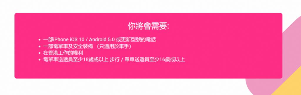 在 Foodpanda,户户送和 keeta 官网浏览,会发现对 " 步兵 " 的要求只有三个:可以在香港合法工作,有一台能使用外卖员 App 的手机,有一个保温箱。如果是车手,平台还会要求外卖员有合法驾驶证件。