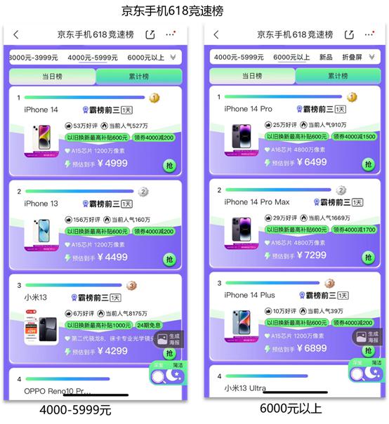 截止 6 月 2 日 15 点,《财经故事荟》通过搜索 " 京东手机 618 竞速榜 " 发现:在 4000-5999 价位段,排名前五的分别为 iPhone14、IPhone13、小米 13、OPPO Ren10 Pro、华为 P60;在 6000 元以上价位段中,TOP5 分别为 iPhone14 Pro 、iPhone14 Pro Max、iPhone14 Plus, 小米 13 Ultra、OPPO Find X6 Pro,苹果霸榜两个价位段,是高端机的绝对霸主。