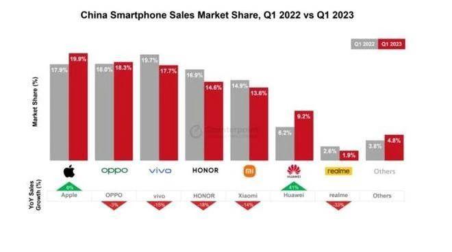 市场调查机构 Counterpoint Research 公布的《2023 年第 1 季度中国智能手机报告》显示,华为第一季度国内出货量逆势增长 41%,国内份额达 9.2%,与排在第五的小米,只有 4.4% 的份额差距。