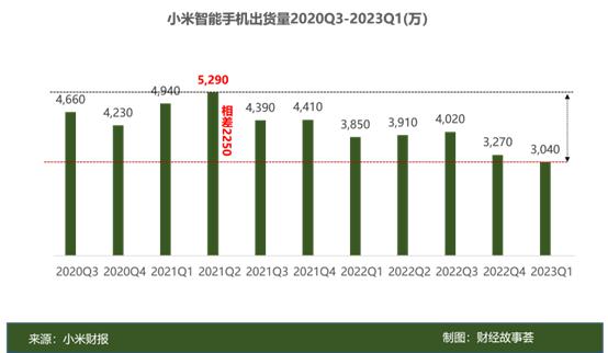 本季度,小米智能手机出货量仅有 3040 万部,同比 2022 年 Q1 的 3850 万部减少 21.1%,和近两年的历史高点—— 2021 年第二季度时的 5290 万部,更是相差 2250 万部,几乎拦腰斩断。
