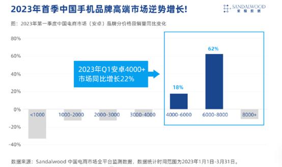 根据 Sandalwood 中国电商市场全平台监测的数据,2023 年第一季度电商市场安卓手机 4000+ 价位销量同比增长 22%;其中 4000-6000 元价位同比增速为 18%,6000-8000 元价位增速最高,同比增速达到 62%。
