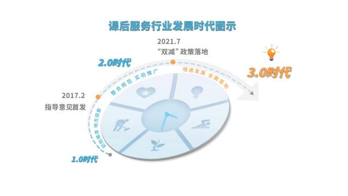 在 " 洪伟聊课后 " 看来,新生事物的萌芽发展有赖于其所处的时代和环境。参考图示,以两大标志性政策为节点,课后服务已从初始萌芽、地方探索的 1.0 时代,走过整合规范、实验推广的 2.0 时代,并在 2021 年 " 双减 " 的驱动下,迈向增速发展、全面落地的 3.0 时代。