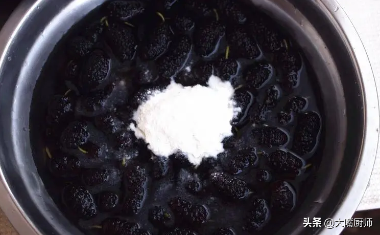 生粉的颗粒很细小,有很好的吸附性(其实食用碱本身的吸附性也很强),通过不停地搅动,就可以把这些脏东西都吸出来,桑葚就变干净了。