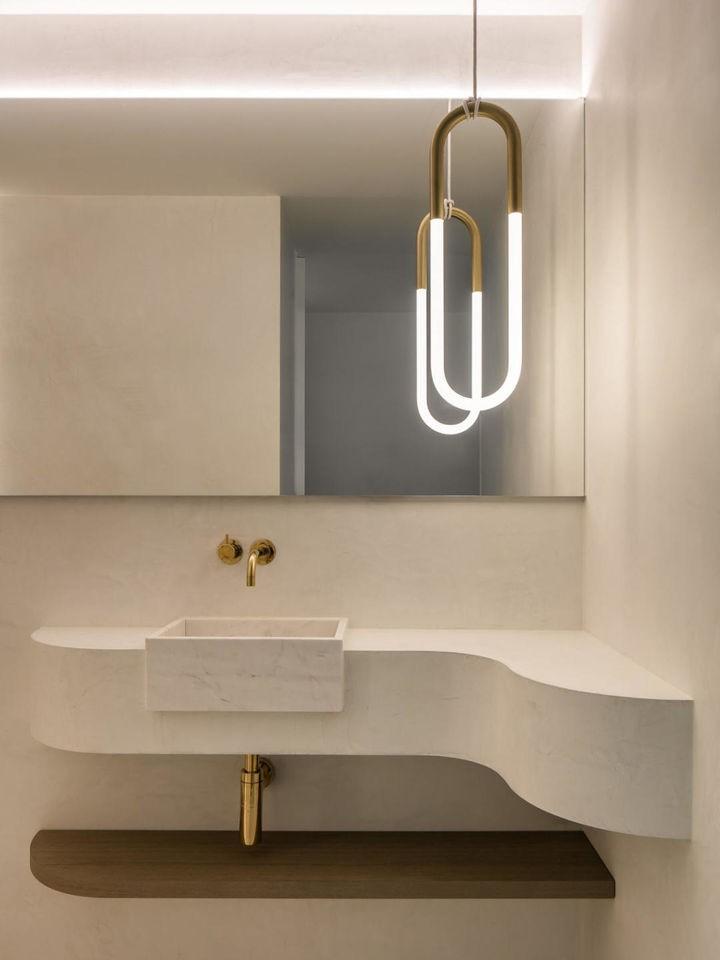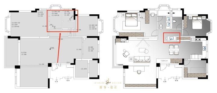 原本入户门正对两个卫生间,为了更好保护隐私,我们将客卫洗手台外移,并加上隔断,解决了这个问题。