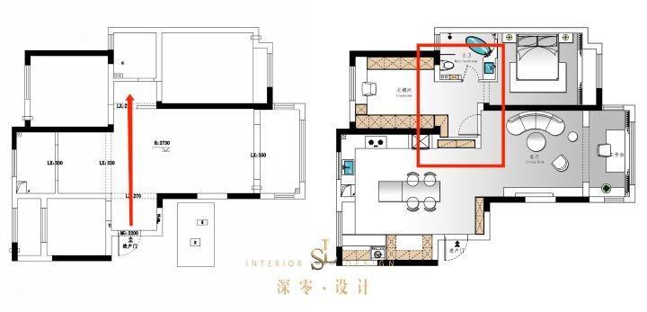 原始入户门正对卫生间,改造后,将卫生间纳入主卧,主卧门洞直接扩到衣帽间入口,有效解决入户正面卫生间的尴尬。