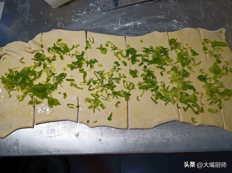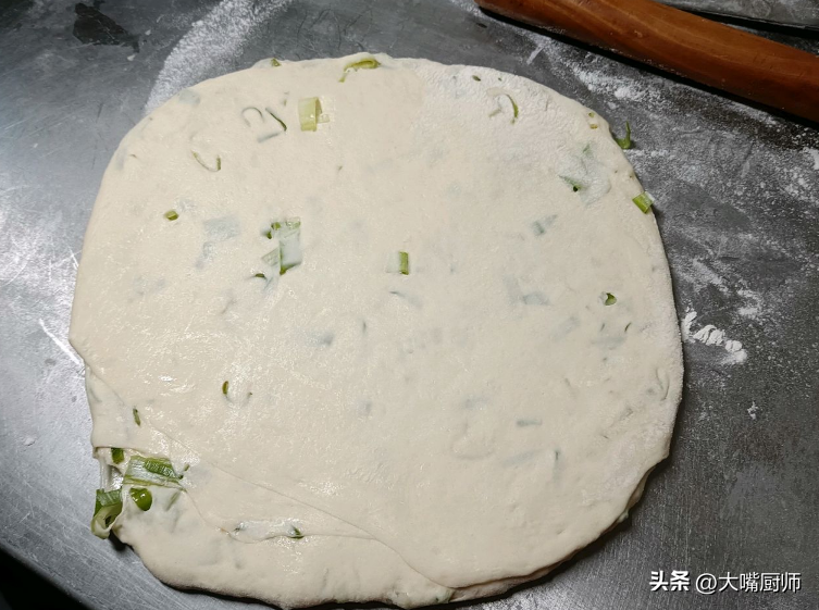 5、在薄面片上均匀地抹上一些油酥,再撒上一把葱花,然后用刀划出几道口子,把面片像叠被子一样折叠起来,叠好后用手压扁,用擀面杖擀成圆饼。