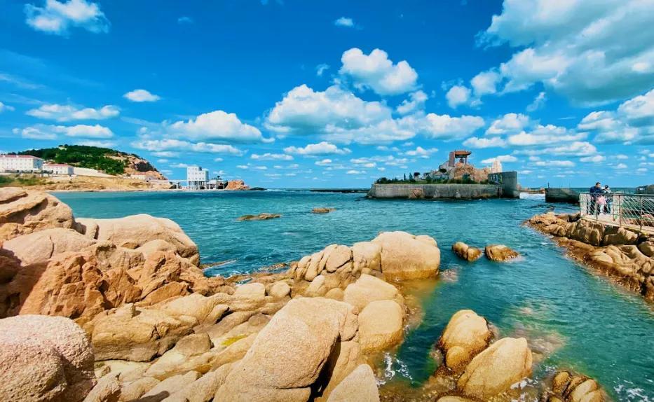 与韩国隔海相望;海岸怪石嶙峋,海水湛蓝清澈,配合着苍翠连绵的群峰看着辽阔的大海,是人们心中理想的旅游圣地。