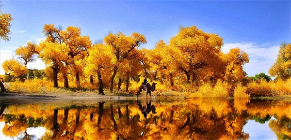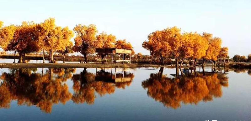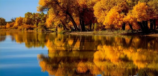 有许多河流和溪流的分支,长满了大戟。沿着塔里木河,胡杨林延伸到广阔的天空。这并不壮观。森林公园五彩缤纷。绿树、清澈的水和蓝天就像一幅带有黄色秋天的厚厚的水墨画。
