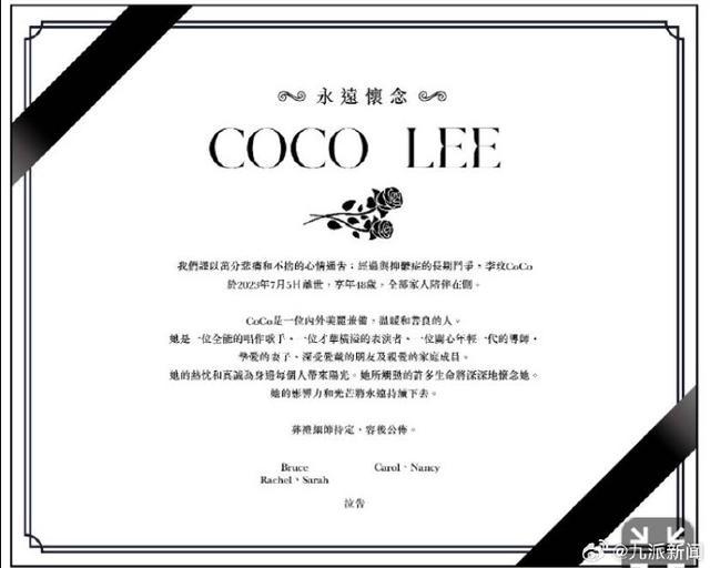 7 月 6 日,李玟老公 Bruce 与李玟两位家姐一同发出讣告,文中提到:" 我们谨以万分悲痛和不舍的心情通告:经过与抑郁症的长期斗争,李玟 CoCo 于 2023 年 7 月 5 日离世,享年 48 岁,全部家人陪伴在侧。CoCo 是一位内外美丽兼备,温暖和善良的人。她是一位全能的唱作歌手,一位才华洋溢的表演者,一位关心年轻一代的导师,挚爱的妻子、深受爱戴的朋友及亲爱的家庭成员。她的热忱和真诚为身边每个人带来阳光。她所触动的许多生命将深深地怀念她。她的影响力和光芒将永远持续下去。葬礼细节待定,容后公布。"