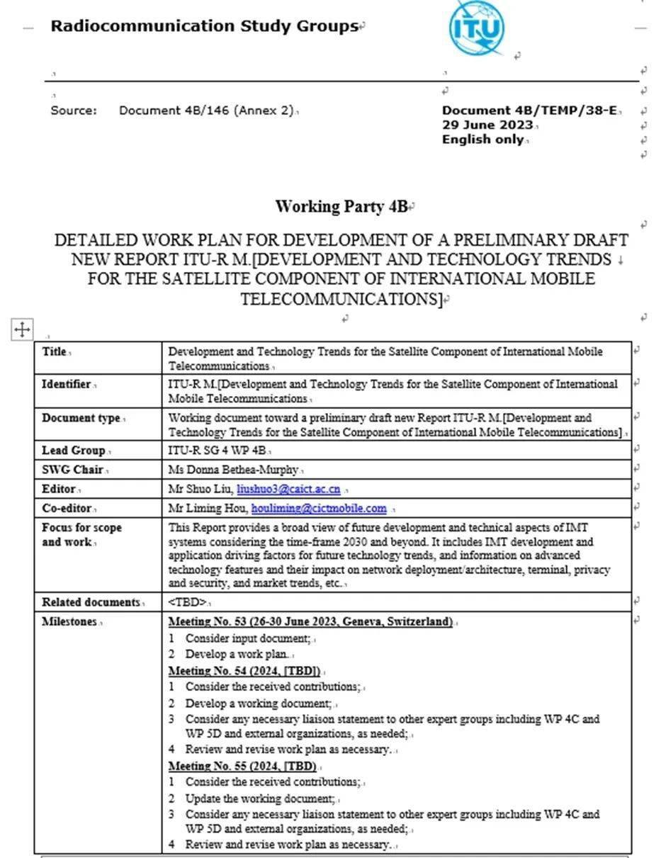 2023 年 6 月 30 日,在国际电信联盟无线电局卫星研究组第二工作组(ITU-R SG4 WP4B)全会上,《卫星国际移动通信(IMT)未来技术趋势》正式获得通过。
