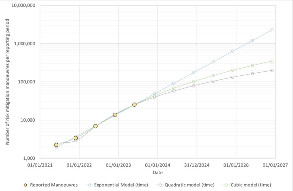 而过去半年的 2 万 5 千次规避机动,大约是该公司在 2022 年 6 月至 11 月的 6 个月里报告避撞机动次数的两倍。如果按照目前星链持续发射卫星的趋势,每过半年,所需采取的规避机动次数就会翻一番,那么到 2024 年上半年,星链或许在半年时间内机动近 10 万次。