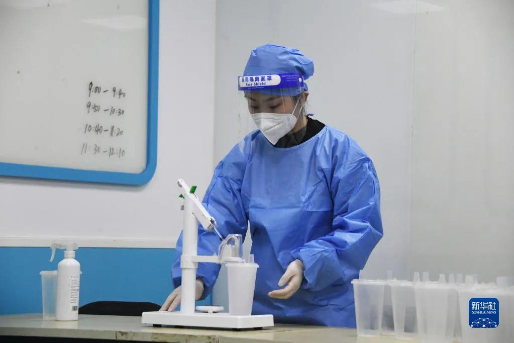 12 月 21 日,在北京市海淀区海淀街道新冠疫苗接种点,医护人员进行吸入式新冠疫苗接种前的准备工作。新华社记者 任超 摄