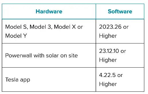 首先当然是要拥有一辆特斯拉,并将车机系统升级到 2023.26 及更高版本,特斯拉 Powerwall 则需要升级到 23.12.10 及更高版本,并且还需要将特斯拉 APP 升级到 4.22.5 版本协调两者工作。