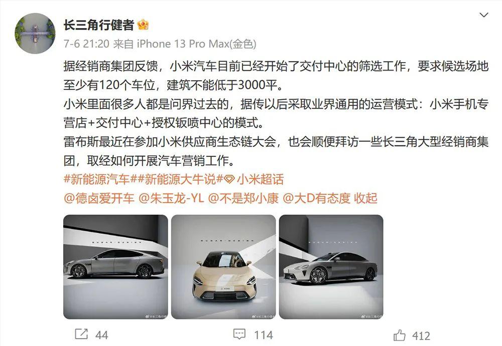 除了制造端的工厂进度,小米汽车销售端也有动态更新。据经销商集团反馈,小米汽车已于近期开始了交付中心的筛选工作。该消息人士透露称小米汽车要求候选场地 " 至少能提供 120 个车位 ",且建筑面积 " 不能低于 3000 平方米 "。