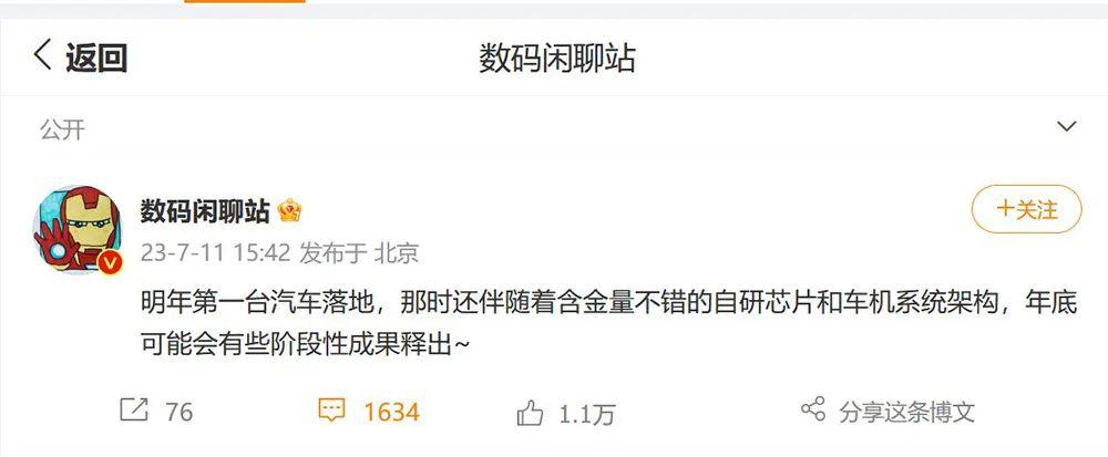 另外,博主 "@数码闲聊站 " 发文表示," 明年第一台汽车落地,那时还伴随着含金量不错的自研芯片和车机系统架构,年底可能会有些阶段性成果释出 "。