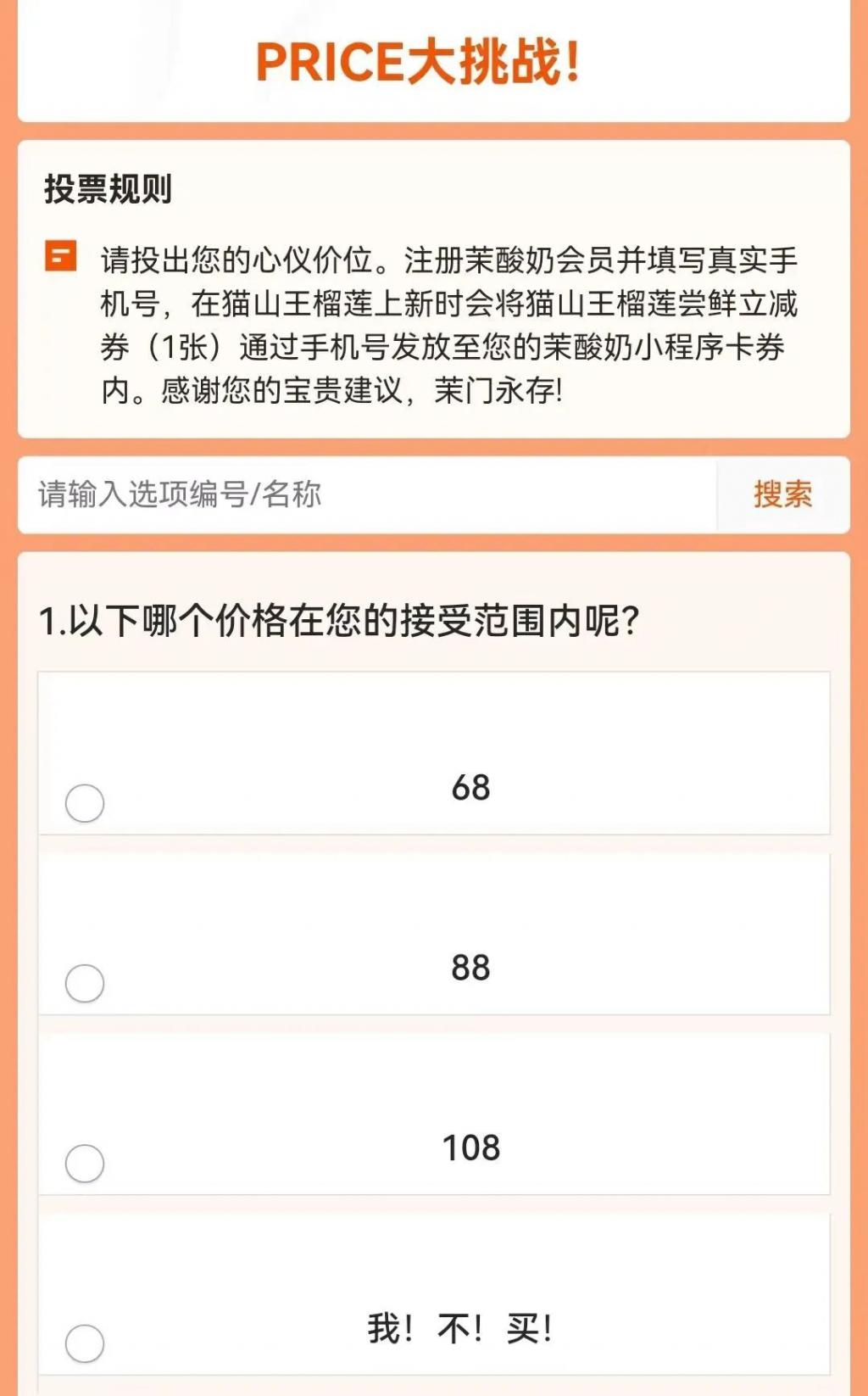 近日,茉酸奶上线了一份问卷调查,征集消费者对即将上新的猫山王榴莲奶昔的心理价位,三个价格选项分别为 68 元、88 元、108 元。并提到," 由于主打真材实料,无法避免昂贵的价格。"