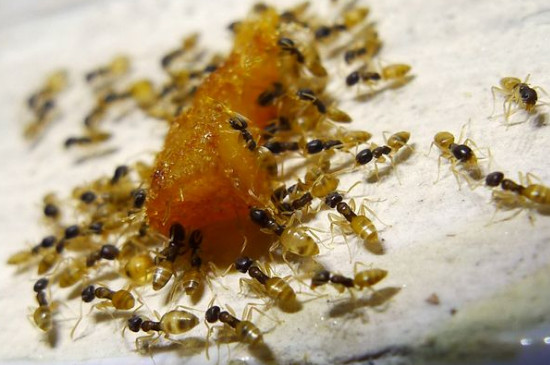 彻底清除小黄蚂蚁最好的办法就是毒饵诱杀,把易吸引蚂蚁的食物放到厨房、储藏粮食或者可疑的蚂蚁洞穴附近,同时掺杂一些专用的蚂蚁杀虫剂,让觅食的蚂蚁将有毒的食物搬入巢穴,食用后被毒杀,连续放3~7天可以彻底杀灭。