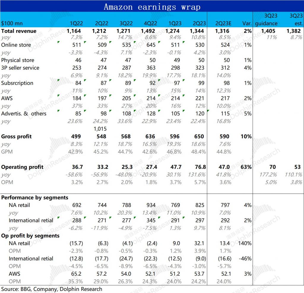 8 月 4 日美股盘后,亚马逊公布了 2023 年二季度财报,虽然 AWS 云业务仍如预期的疲软,但零售版块同样像我们期待,出现了明确的经营杠杆的拐点,利润修复进度再超预期,财报要点如下: