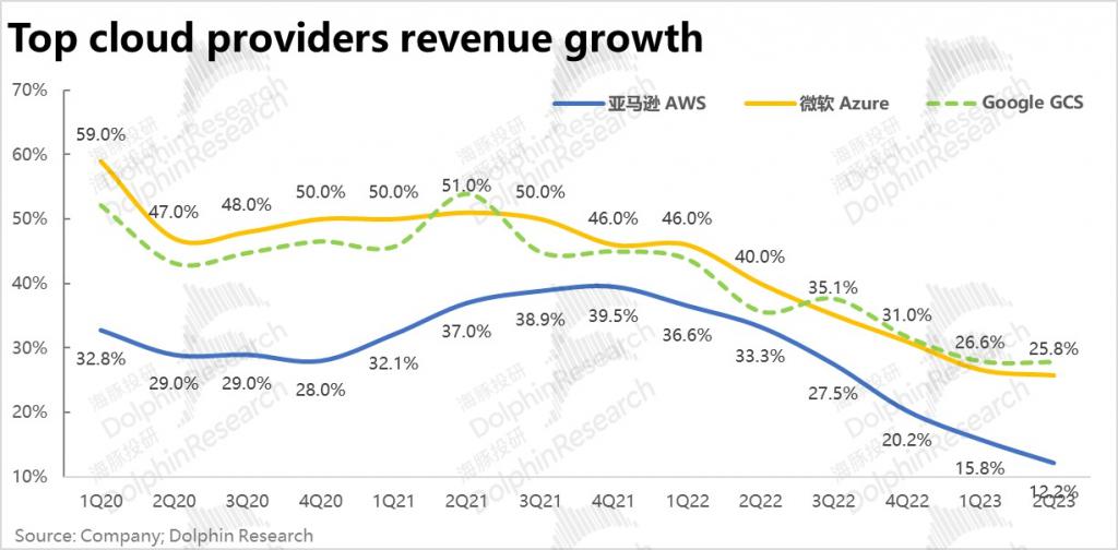 即便行业内对 AI 的热情高涨,微软、谷歌和亚马逊在业绩会上也屡次提及 AI 相关的新功能,但本季度微软的 Azure 收入增速在继续放缓,亚马逊旗下的 AWS 也同样未见增速的拐点。