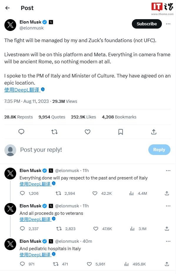 IT 之家 8 月 12 日消息,IT 之家昨天曾报道马斯克计划将 " 马扎笼斗 " 改成辩论赛的消息,可没过多久,这位亿万富翁又声称这场战斗仍将举行,地点位于意大利的 " 一个史诗般的地方 "。