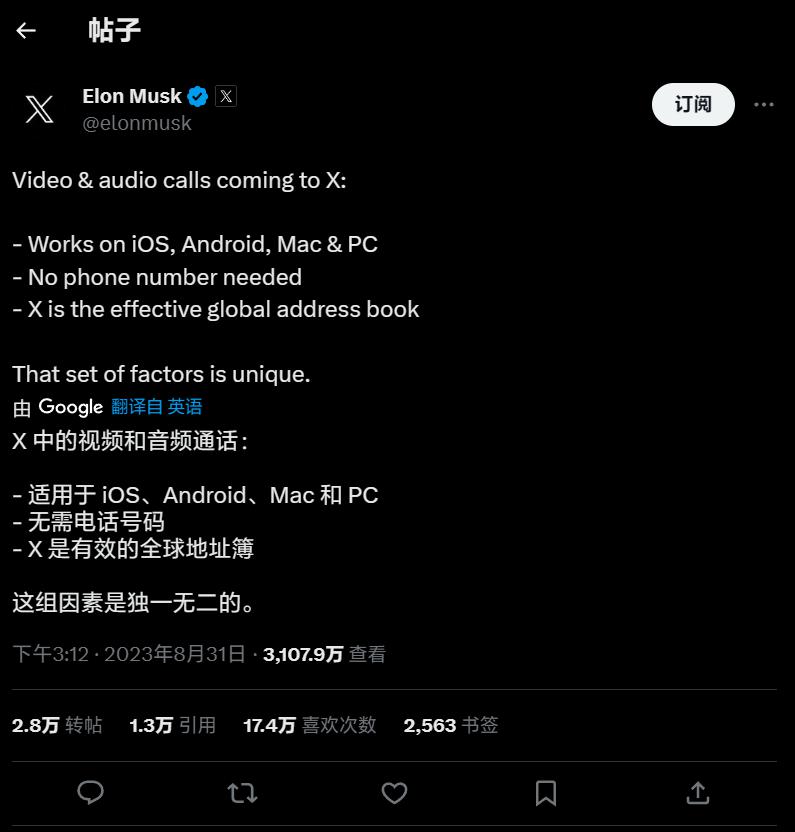欲比拟微信:马斯克官宣 X 平台即将更新“音频与视频通话”选项