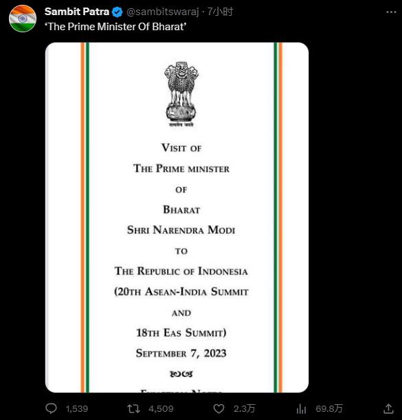 印度执政党官方发言人在社交媒体上,称呼莫迪为巴拉特总理(图源:社交媒体截图)