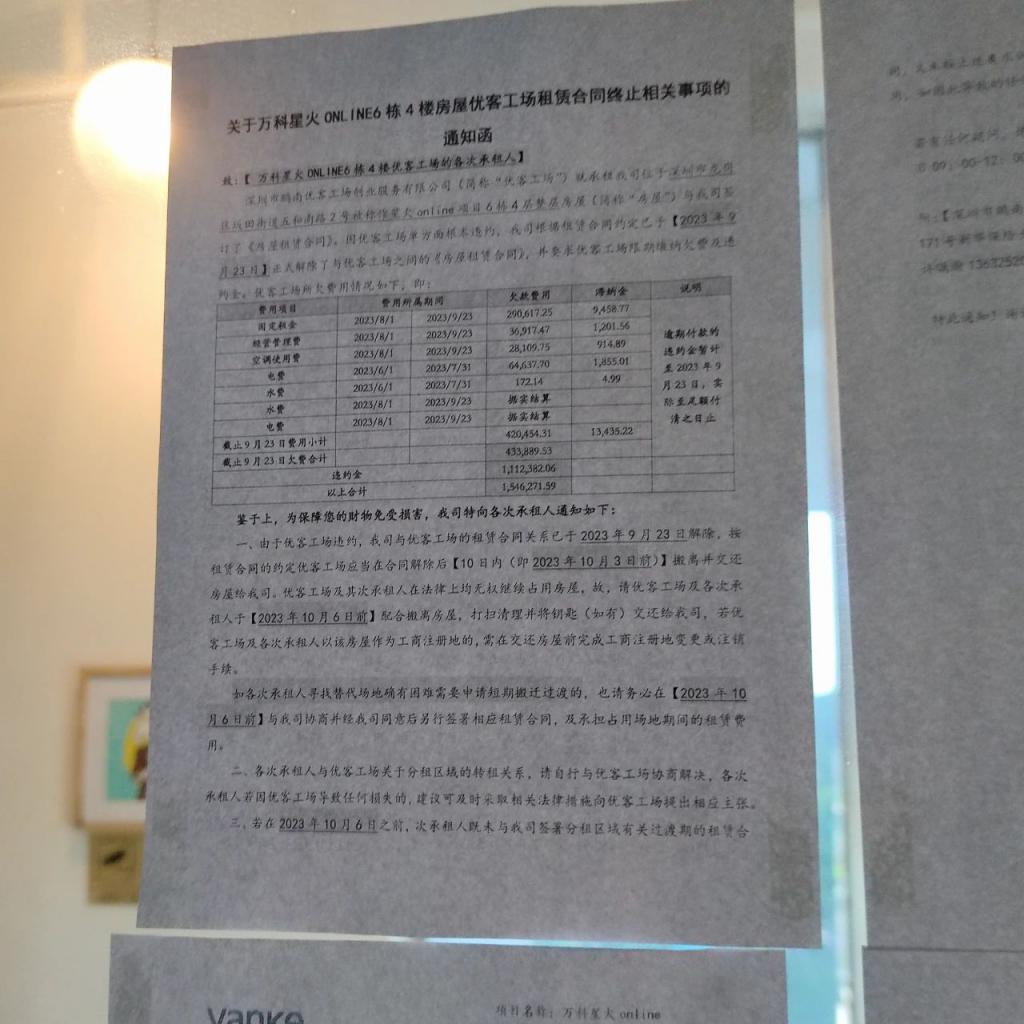 9 月中旬,万科物业在优客工场共享办公区域两侧出口处贴上纸质的租金催缴告示,租客们这才知道优客方欠钱了。细问之下才了解到,优客工场从今年六七月份开始就已经缴纳不起每个月 20 万元的租金,而该场地所有租客的押金林林总总也有接近 60 万元的缺口。