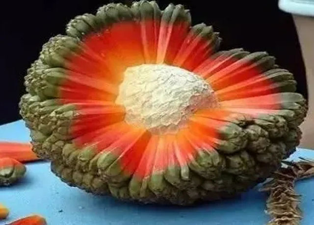 哈拉果也是比较少见和奇葩的一种水果,它的口感是甜的,它有一个内核和数百个突起的条状果肉,吃法跟吃甘蔗差不多,就是吃它的汁,然后把渣吐掉。
