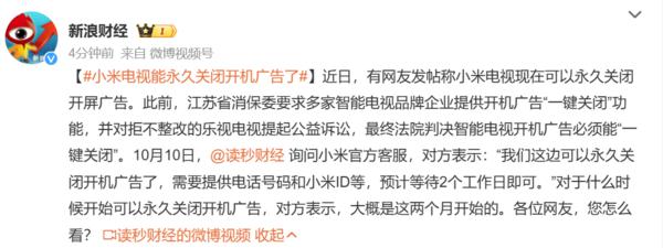 小米电视可永久关闭广告了!找小米客服 2 工作日生效