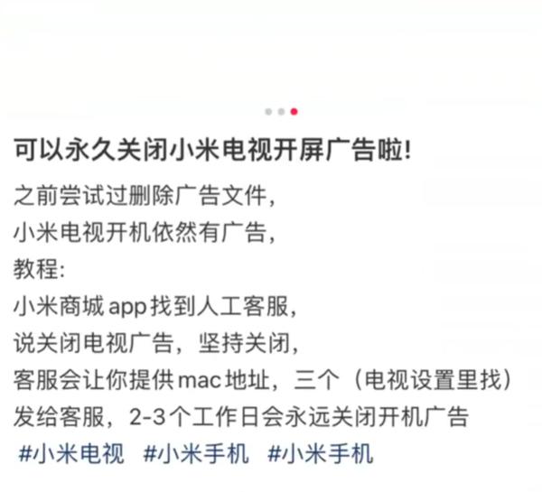 从该网友的发帖可知,与此前网传的各种设置和删除文件不同,如今要想关闭小米电视的开机广告操作十分简单,那就是前往小米商城 App,找到人工客服,向其表示自己要求关闭小米电视广告,只要自己态度坚决,客服会让你提供三个 mac 地址(在电视设置里找),将其发给客服后,等待 2-3 个工作日就会永远关闭开机广告。
