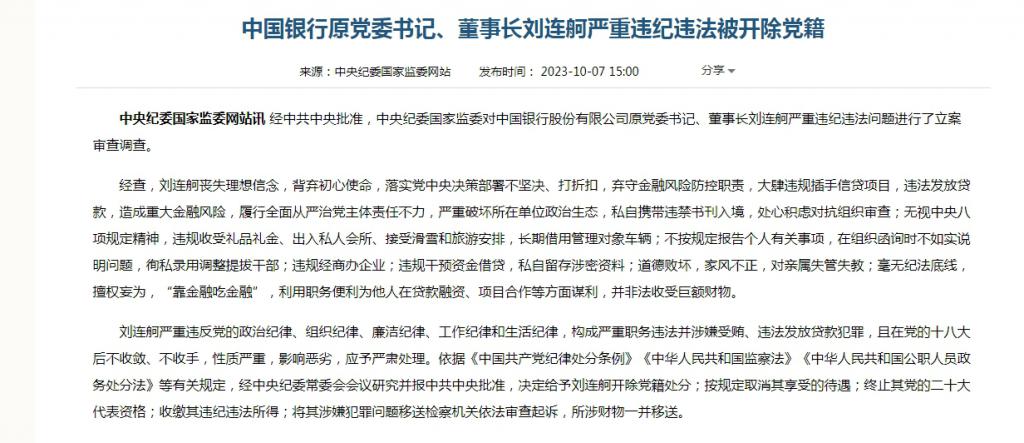 中新经纬 10 月 7 日电 据中央纪委国家监委网站 7 日通报,经中共中央批准,中央纪委国家监委对中国银行股份有限公司原党委书记、董事长刘连舸严重违纪违法问题进行了立案审查调查。