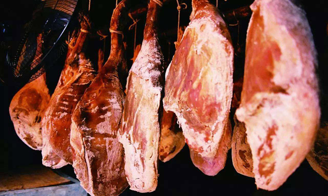 老窝火腿特别之处在于腌制过程中,使用了木姜子先熏制,长久的晾晒使得火腿外表丑陋,其实内芯更具香料清香。老窝镇境内最高海拔3606米,最低海拔1080米,气候条件十分适宜腌制火腿。
