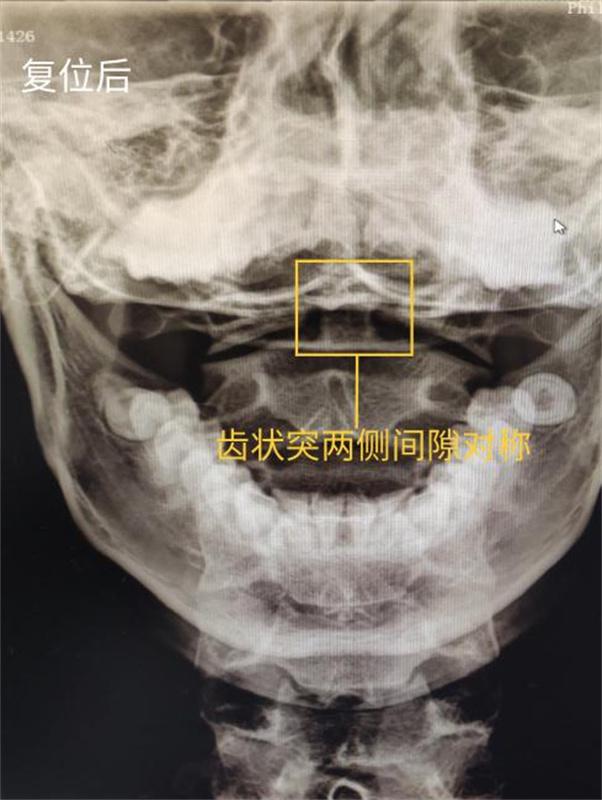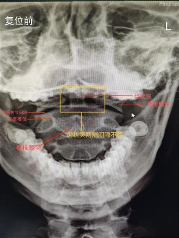 推拿科接诊医师为进一步明确病因,仔细为小陈查体,摄片提示:双侧寰枢关节欠对称,齿状突欠居中,齿状突距左侧寰椎侧块 6mm 较右侧增宽 3mm。推拿科医师决定为行推拿正骨治疗。当场,小陈的 C2 双侧横突压痛消失。