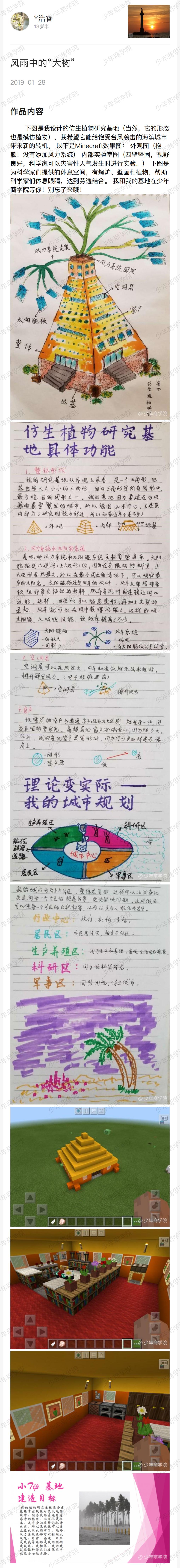 再比方说,有的孩子喜欢研究植物,说我要设计一个仿生的植物研究基地,那么他是怎么做的呢?他一方面查资料,然后还画了图,清晰地展示了仿生植物研究基地的具体功能,这是孩子在少年商学院通过项目制学习后,最后呈现的作品之一。