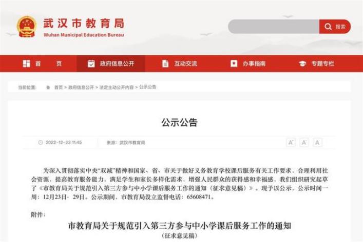 12 月 23 日,武汉市教育局发布《市教育局关于规范引入第三方参与中小学课后服务工作的通知(征求意见稿)》,其中提到,中小学可规范引入第三方参与中小学校课后服务工作,各学校开展课后服务坚持以校内资源为主,合理引入第三方参与课后服务,原则上不超过课后服务总量的 30%,要制定严格的校外机构和社会专业人员的遴选机制,坚持市级统筹,以区为主的管理机制。联想到去年的 12 月 31 日,武汉市教育局当时联合发改委、财政局、人社局联合印发《关于进一步做好义务教育学校课后服务工作的通知》,明确了新学期课后服务的收费标准,正式拉开了湖北省的课后服务向家长收费的序幕。时隔近一年,相信随着武汉市的《征求意见稿》的落地,湖北省的课后服务即将步入一个新阶段。