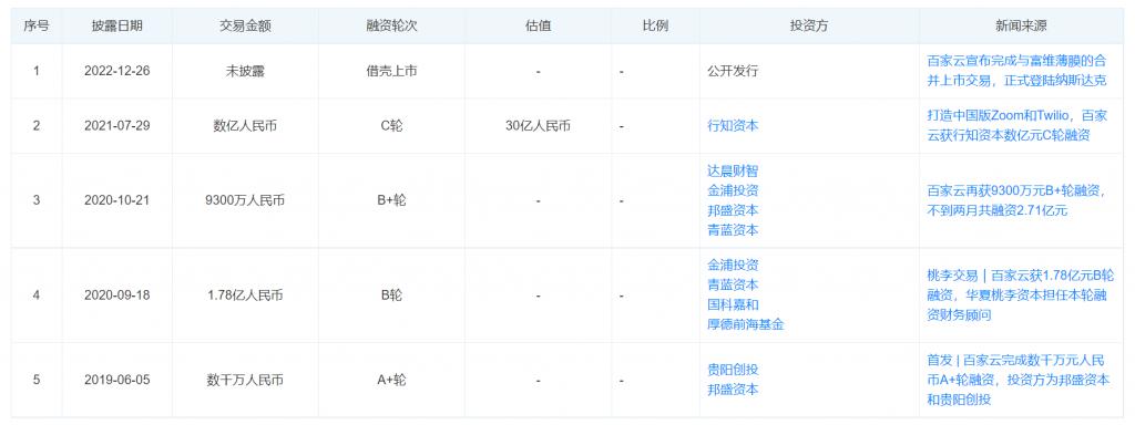 根据天眼查信息,百家云上市前获多轮融资,投资方包括达晨财智、高榕资本、启赋资本、国科嘉和等。2021 年 7 月,百家云获行知资本数亿人民币 C 轮融资,公司估值 30 亿人民币。