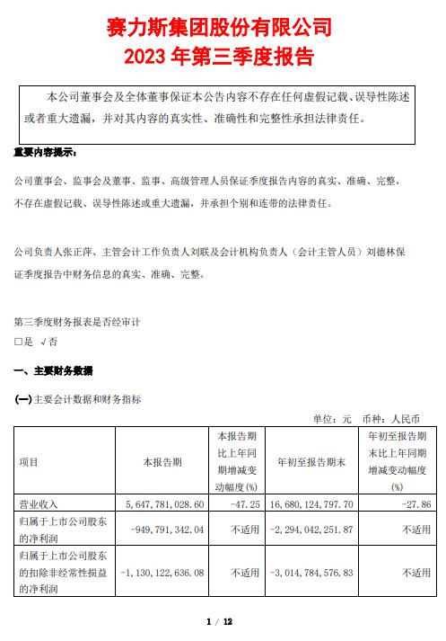IT 之家 10 月 28 日消息,据上证 e 互动平台,赛力斯集团股份有限公司今日公布了 2023 年第三季度报告。报告数据显示,该季度赛力斯集团实现 56.48 亿元营收,同比下滑 47.25%,净亏损额约为 9.5 亿元,去年同期净亏损为 9.47 亿元。不过,该季度经营活动产生的现金流量净额同比增长了 147.59%。