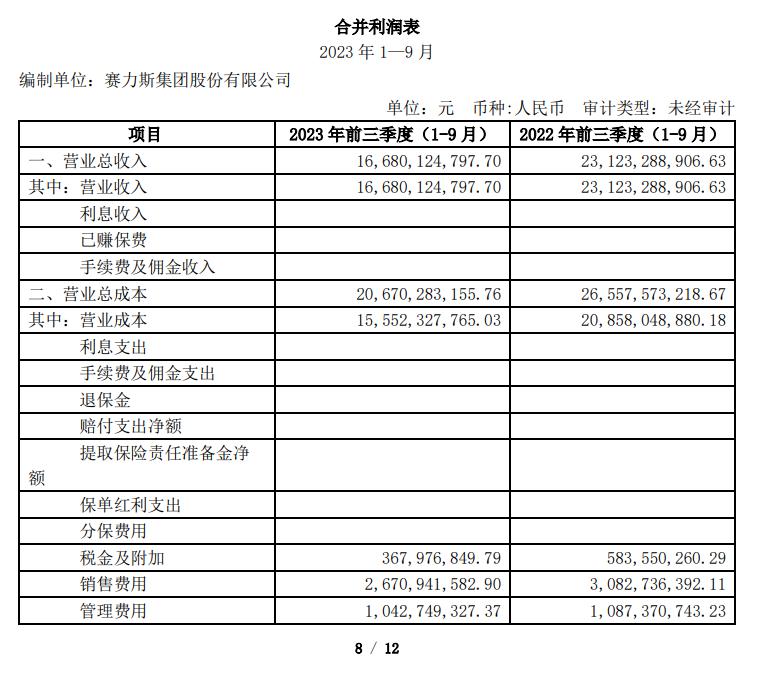 若从今年累计来看,前三季度赛力斯集团营收 166.8 亿元,同比下滑 27.86%,净亏损 22.94 亿元,去年同期约为 26.75 亿元,营收情况开始出现好转。