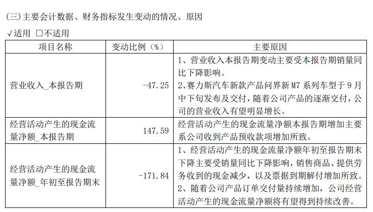 赛力斯集团表示,该季度营收变化的主要原因是销量同比下降,新款产品问界新 M7 系列车型于 9 月下旬发布、交付,随着公司产品逐渐交付,营业收入有望明显增长。