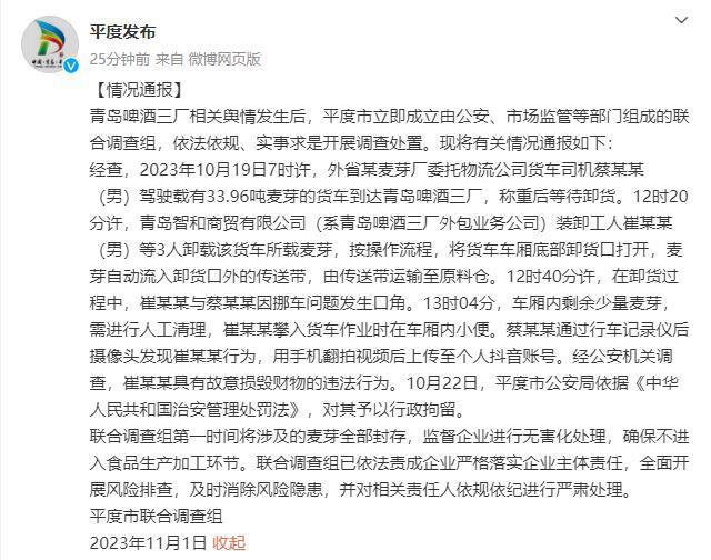据 @平度发布 :青岛啤酒三厂相关舆情发生后,平度市立即成立由公安、市场监管等部门组成的联合调查组,依法依规、实事求是开展调查处置。现将有关情况通报如下: