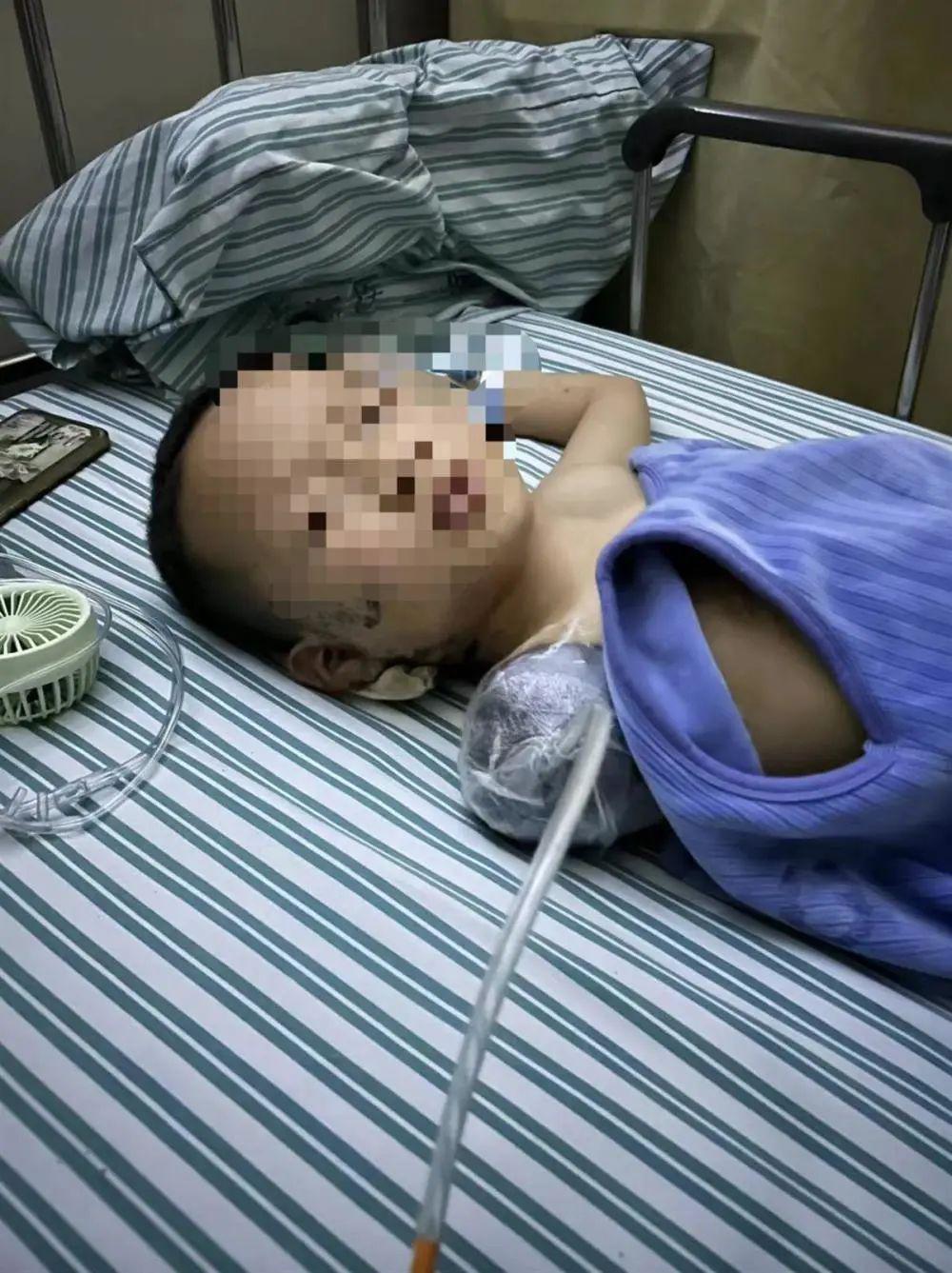 事故发生时,孩子父亲还有不少村民也在旁边。家人立即将豆豆送到医院,但因孩子右臂受伤过于严重,最后只能截肢处理。除了截肢,孩子的右耳右脸被缝了多针,右耳膜也破裂。