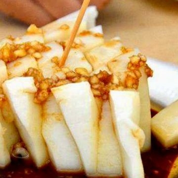 水籺(hé ), 北海南康镇最具有代表性的小吃之一,已有300多年历史,被列入为非物质文化遗产。用大米舂成粉末制成,当地人也亲切的叫它“米糕”。俗话说吃籺不吃蒜,灵魂少一半,所以南康水籺的灵魂也在于蒜末。传统的吃法是搭配蒜蓉和生抽,爽滑的口感,受到本地人的青睐。
