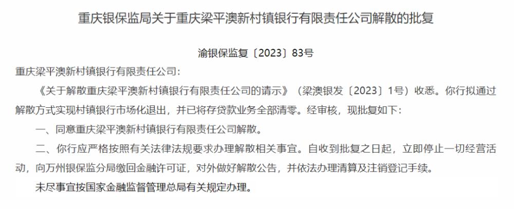 2023 年 7 月,重庆梁平澳新村镇银行拟通过解散方式实现村镇银行市场化退出,并已将存贷款业务全部清零。公开资料显示,重庆梁平澳新村镇银行由澳大利亚和新西兰银行集团有限公司出资成立,是一家外国法人独资银行。