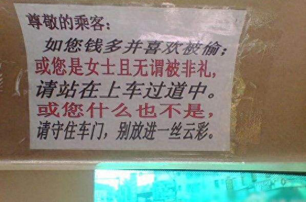 尊敬的乘客:如您钱多并且喜欢被偷;或您是女士且无所谓被非礼,请站在上车过道中。或您什么也不是,请守住车门,别放进一丝云彩。