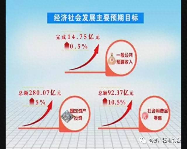 一般公共预算收入(新口径)完成14.75亿元,增长0.5%;固定资产投资总额完成280.07亿元,增长5%;社会消费品零售总额完成92.37亿元,增长10.5%;
