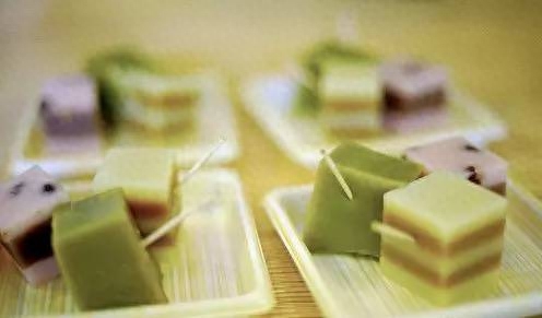 这是一种透明的糕点。做法是首先用开水将米粉溶化,然后再加糖后用蒸笼蒸制而成的,口感丰实,味道微甜,入口即化,是茶会上不可缺少的点心。