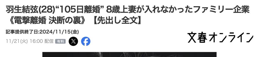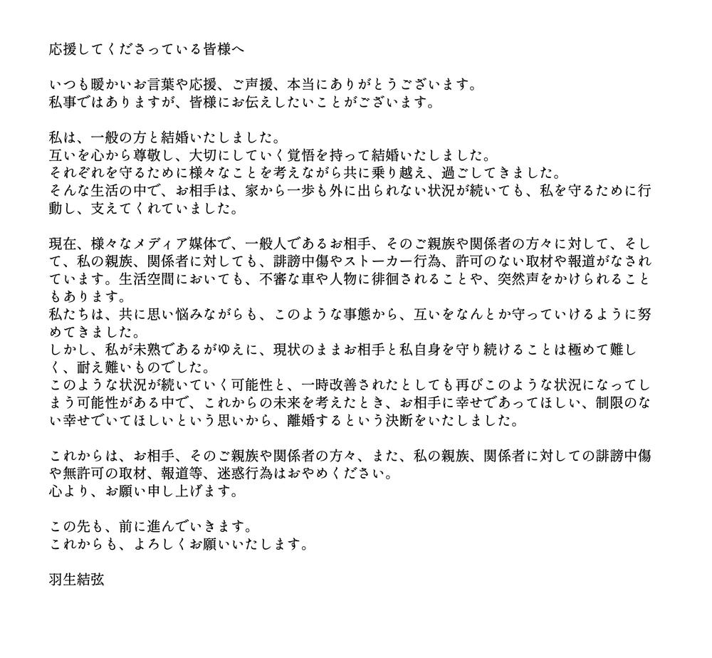 离婚的理由更为罕见,在推特 ( X ) 发表的声明中,羽生把一切责任归咎于媒体的过度骚扰。
