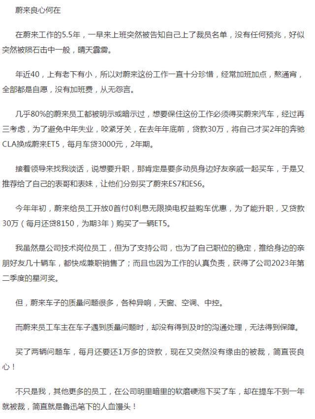 IT 之家 11 月 19 日消息,据金融界报道,近日,一位在蔚来汽车工作了 5.5 年的技术岗位员工爆料,自己为了保住工作,不得不贷款 60 万购买了两辆蔚来汽车,还推荐了亲戚朋友也买了蔚来汽车,但最终还是被公司裁掉。他称自己上有老下有小,每月要还一万多元的车贷,生活无望。